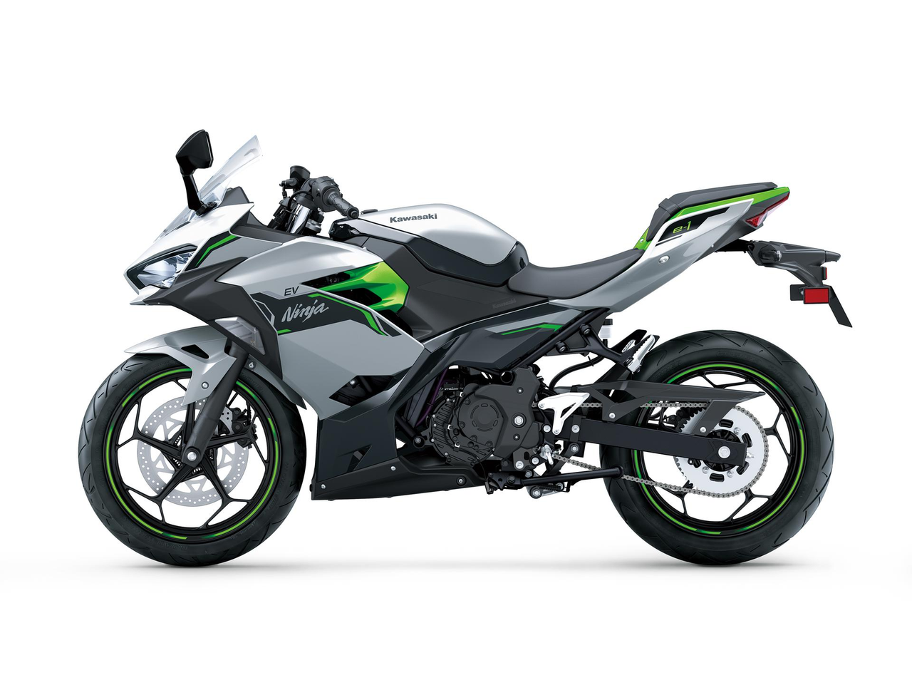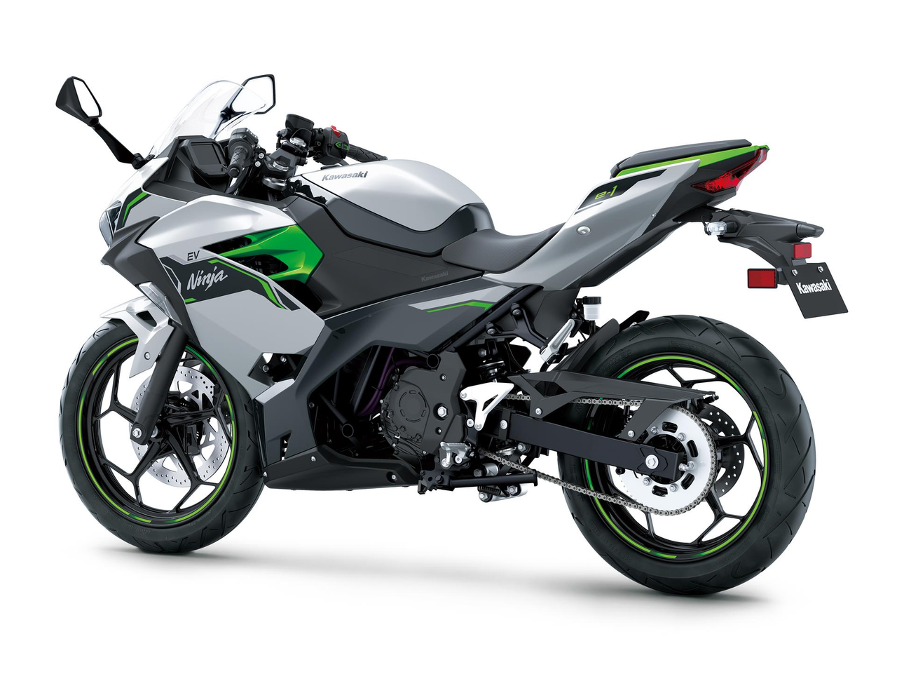 A vonzó Ninja és Z motorkerékpár-stílust kiegészítve az ezüst és matt limezöld színezés friss, futurisztikus megjelenést kölcsönöz a Kawasaki EV modelljeinek.