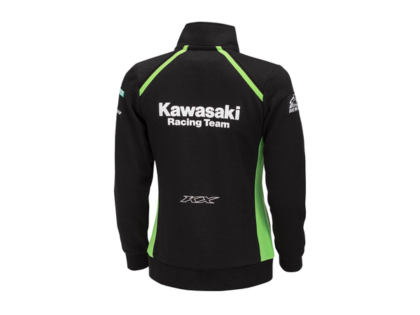 Kawasaki MXGP csapat zöld-fekete replika cipzáras pulóver cipzáras külső zsebekkel, állógallérral, bordázott szegéllyel és mandzsettával.