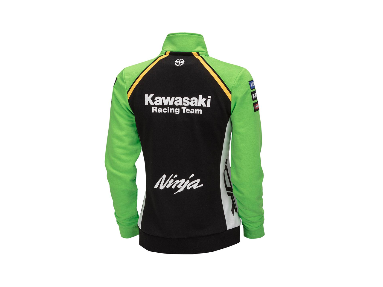 Női cipzáras pulóver Kawasaki 2024 WSBK csapatszínekben, cipzáras külső zsebekkel, álló gallérral, bordázott szegéllyel és mandzsettával.