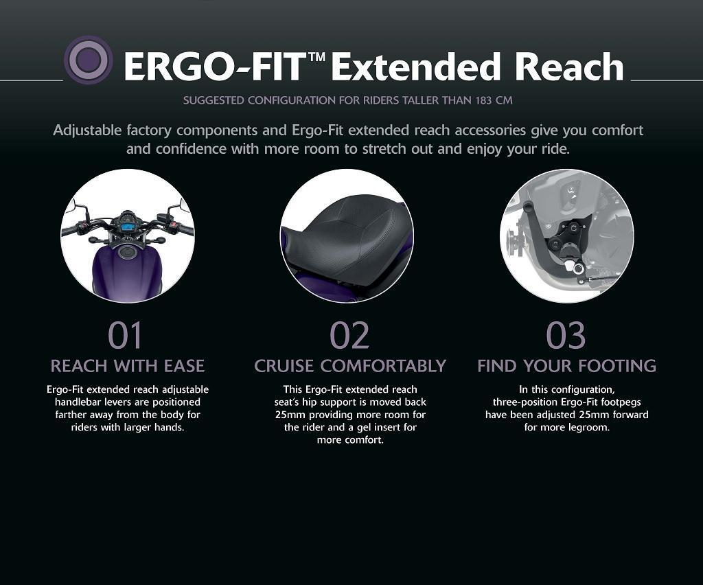 Az állítható gyári alkatrészek és az Ergo-Fit megnövelt elérési távolságú kiegészítők nagyobb mozgásteret biztosítanak, így kényelmesebb, magabiztosabb testhelyzetet tesznek lehetővé a hosszabb utakon is.