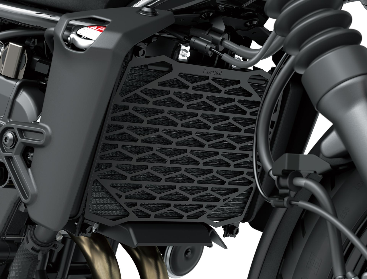 Stílusos fekete hűtővédő, amely rozsdamentes acél ráccsal óvja a hűtőt az útról felverődő törmeléktől.